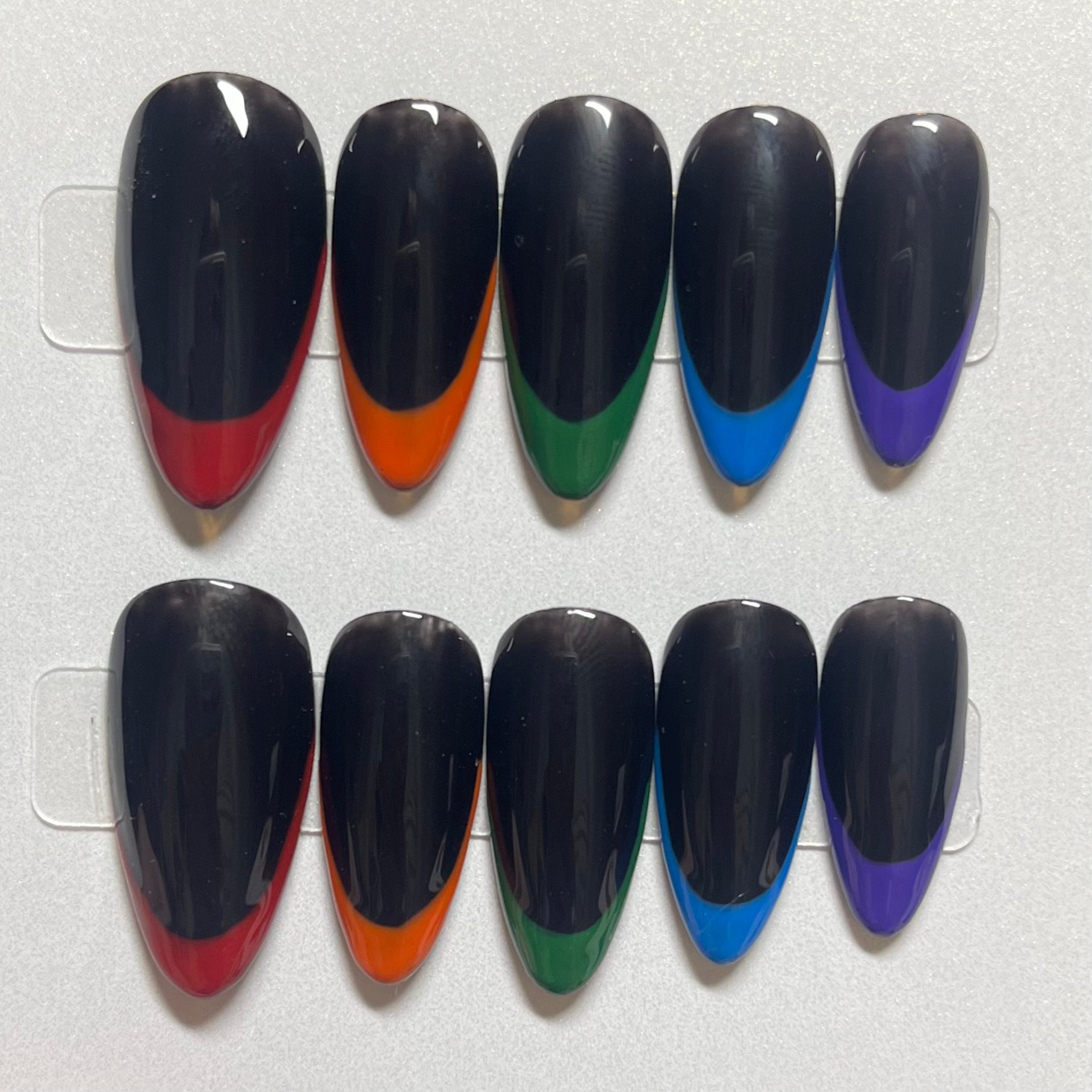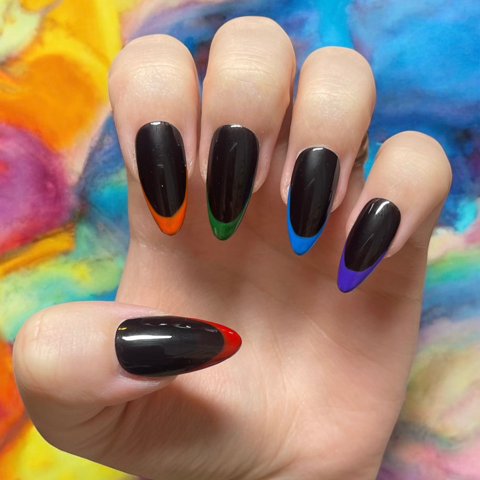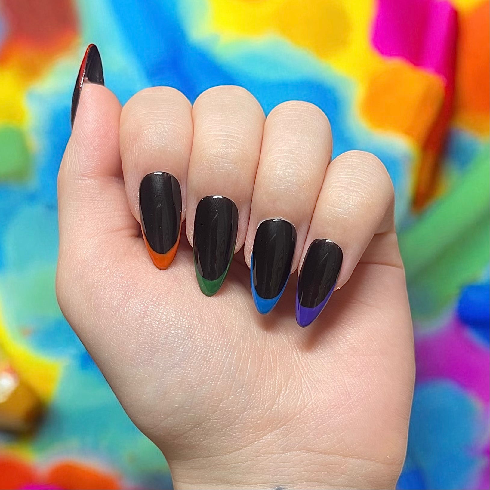 Unleash your inner artist with these bold Crayon Couture press-on nails. Featuring a sleek black base with vibrant, crayon-inspired tips in an array of playful colors.