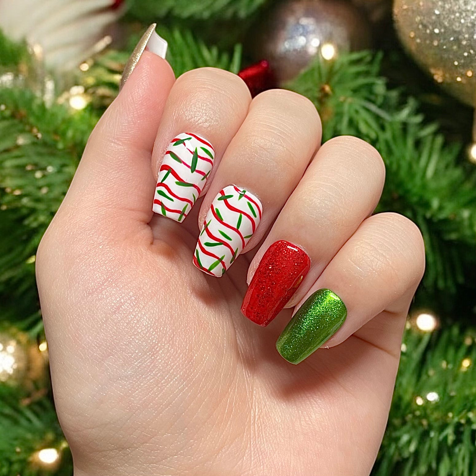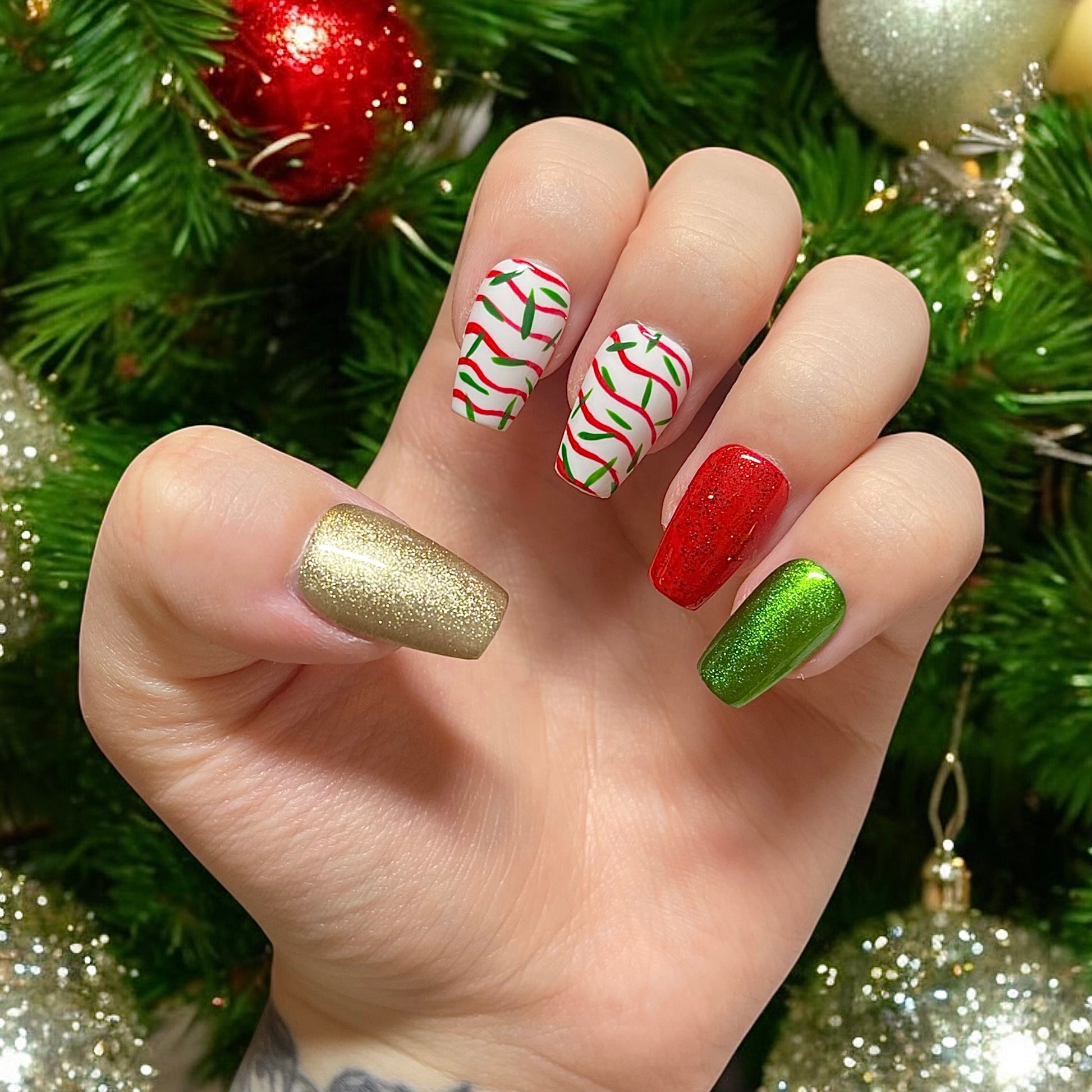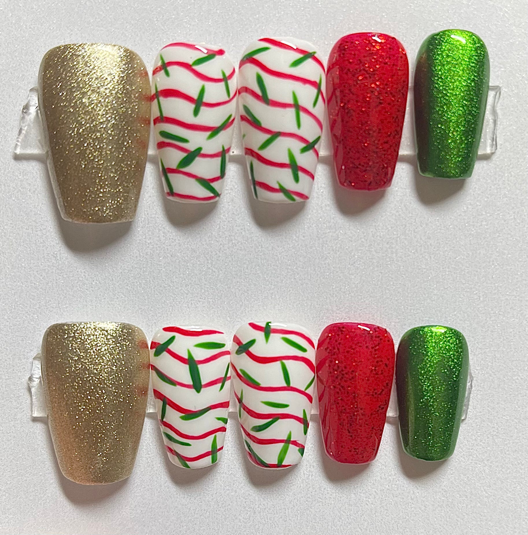 Embrace the magic of the holiday season with these stunning press-on nails. Featuring a perfect blend of festive red, lush green and gold hues, these nails are adorned with intricate pine tree designs that capture the beauty of a winter forest.