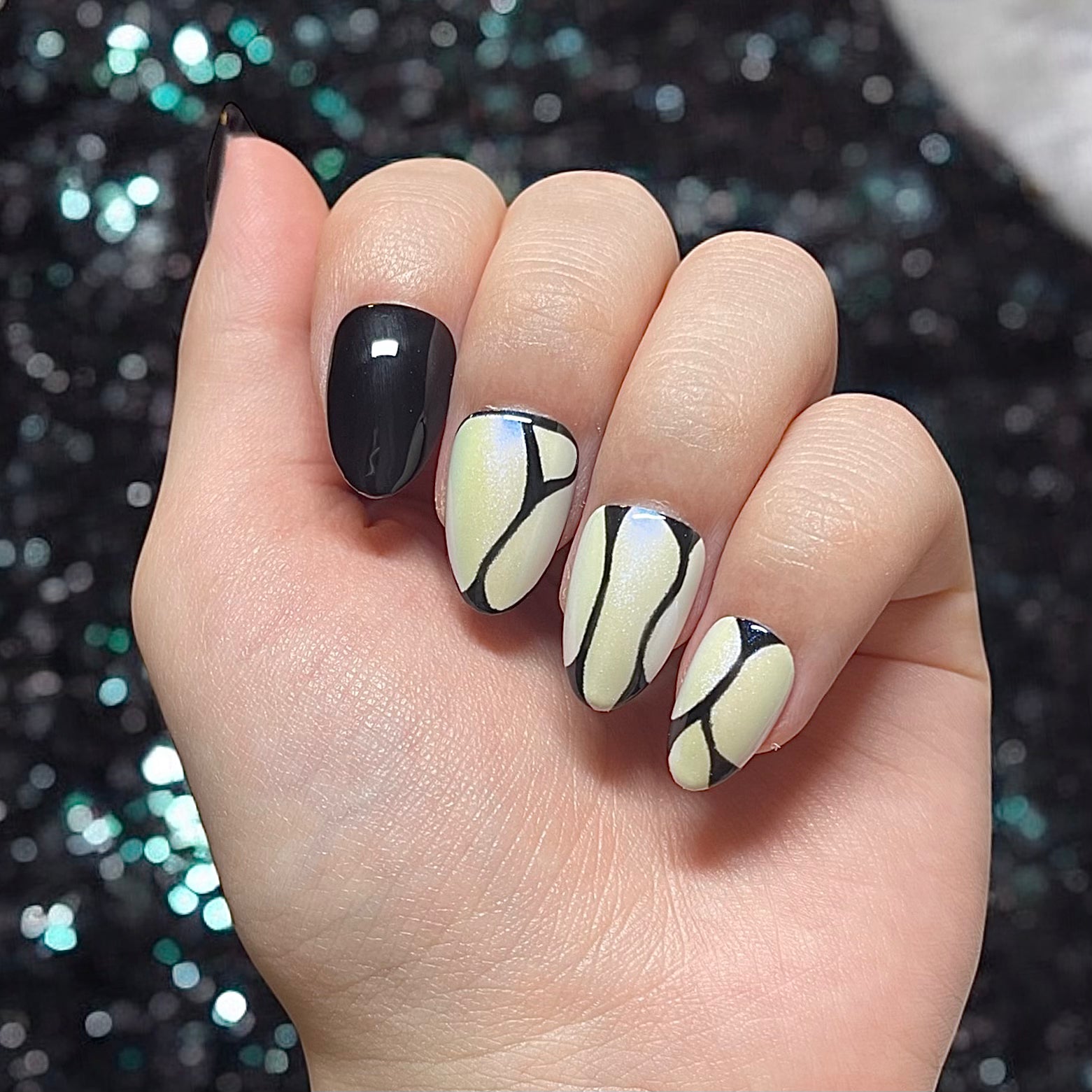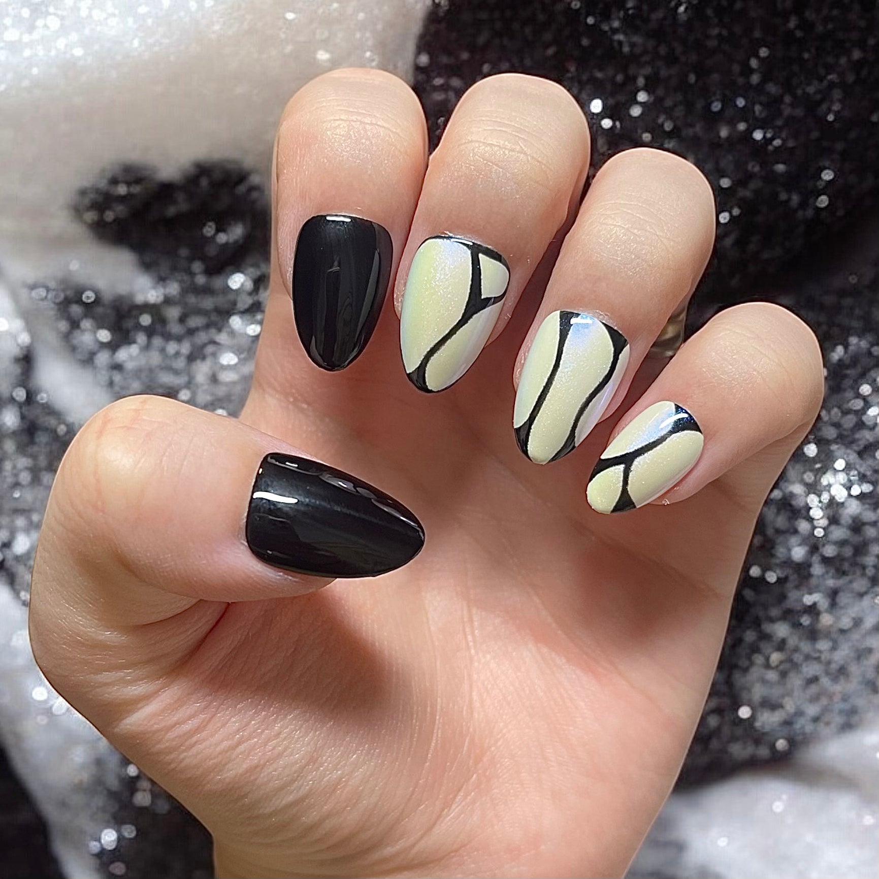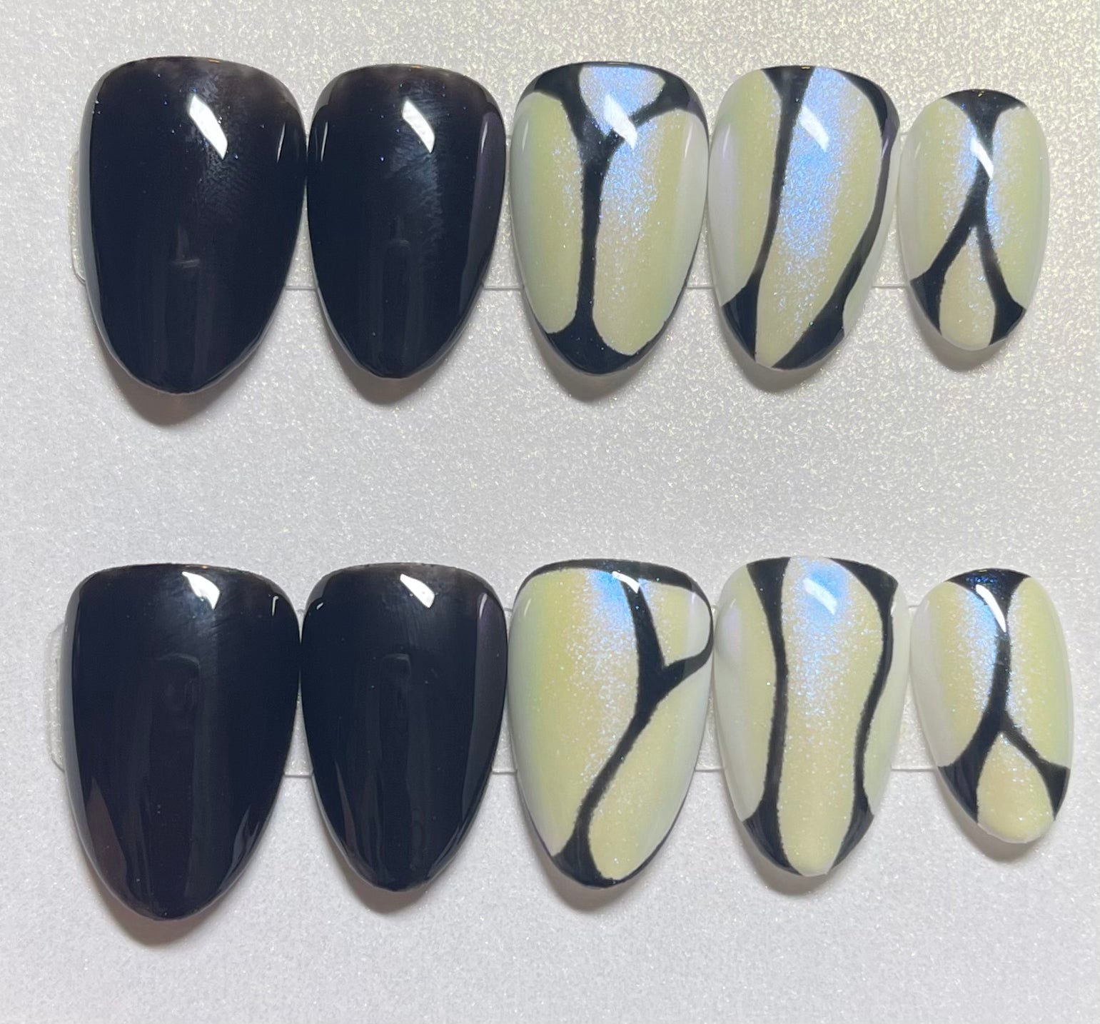 Iridescent Obsidian nails offer a striking blend of sleek, bold black with a mesmerizing pearlescent finish. This holographic set features a unique interplay of light, where the deep obsidian hue transitions into soft white iridescence, creating a sophisticated and ethereal look.