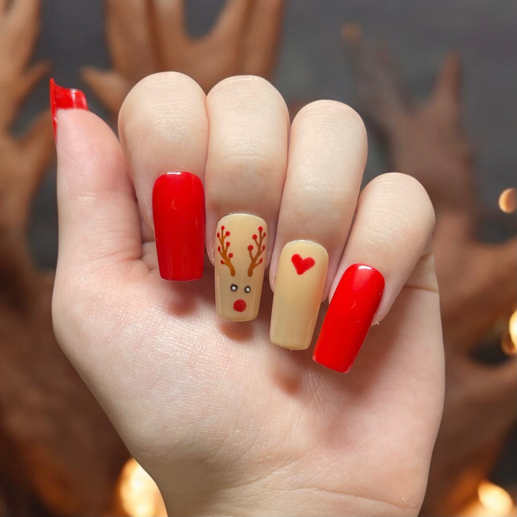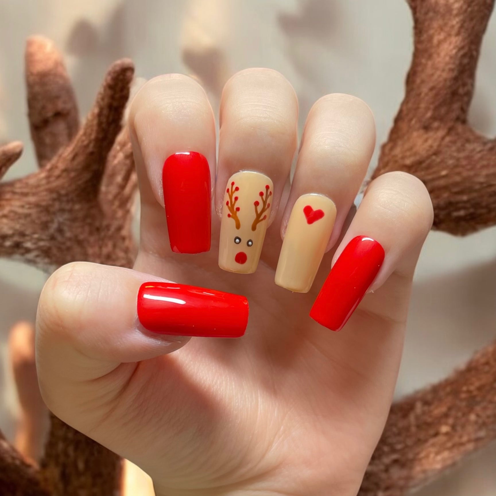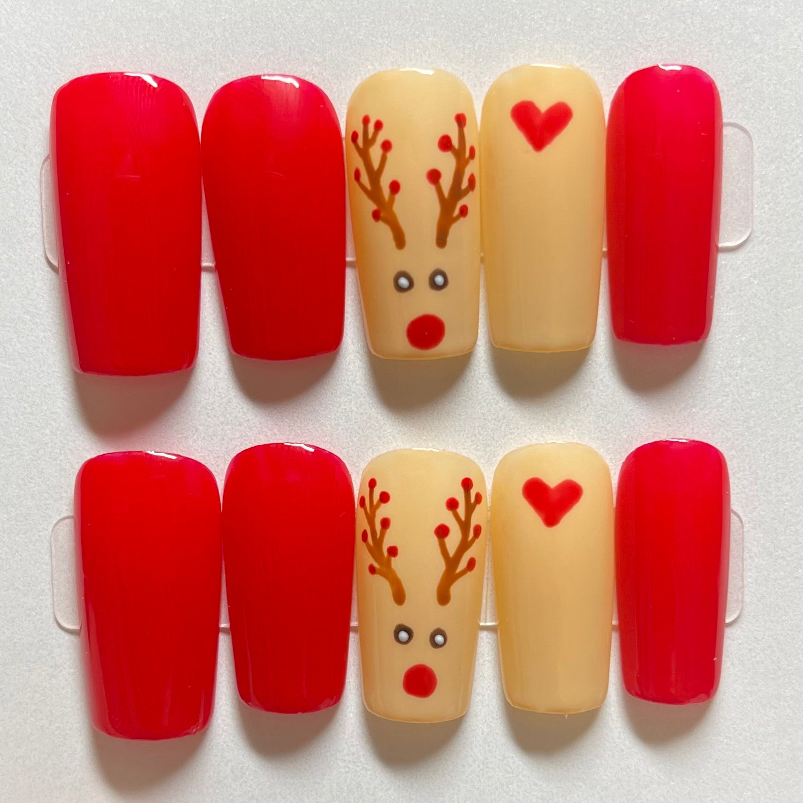 Jolly Red Nose press-on nails bring the festive magic of Christmas to your fingertips. Featuring a vibrant red base adorned with a cute, smiling Rudolph and his signature red nose, these nails capture the cheerful spirit of the season.