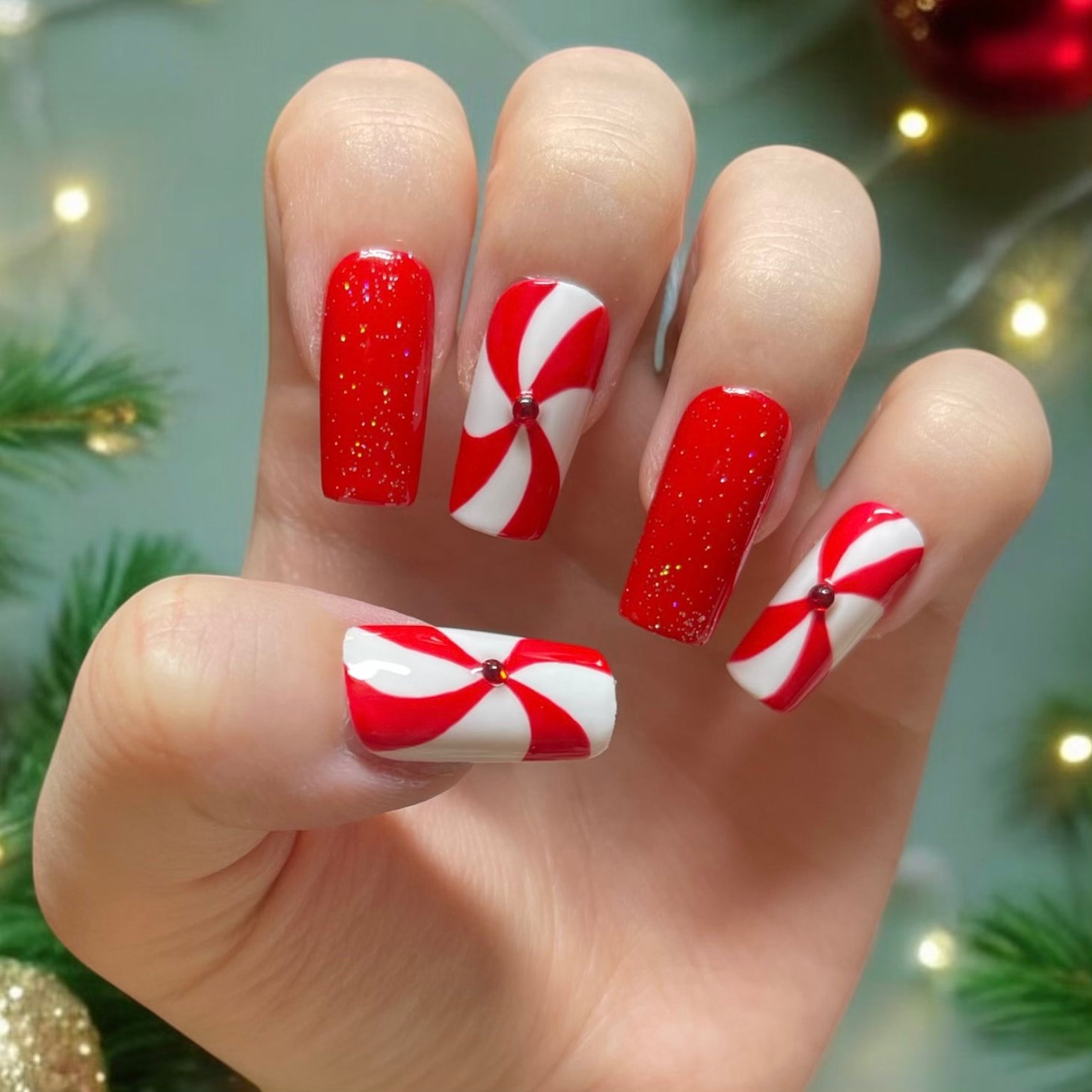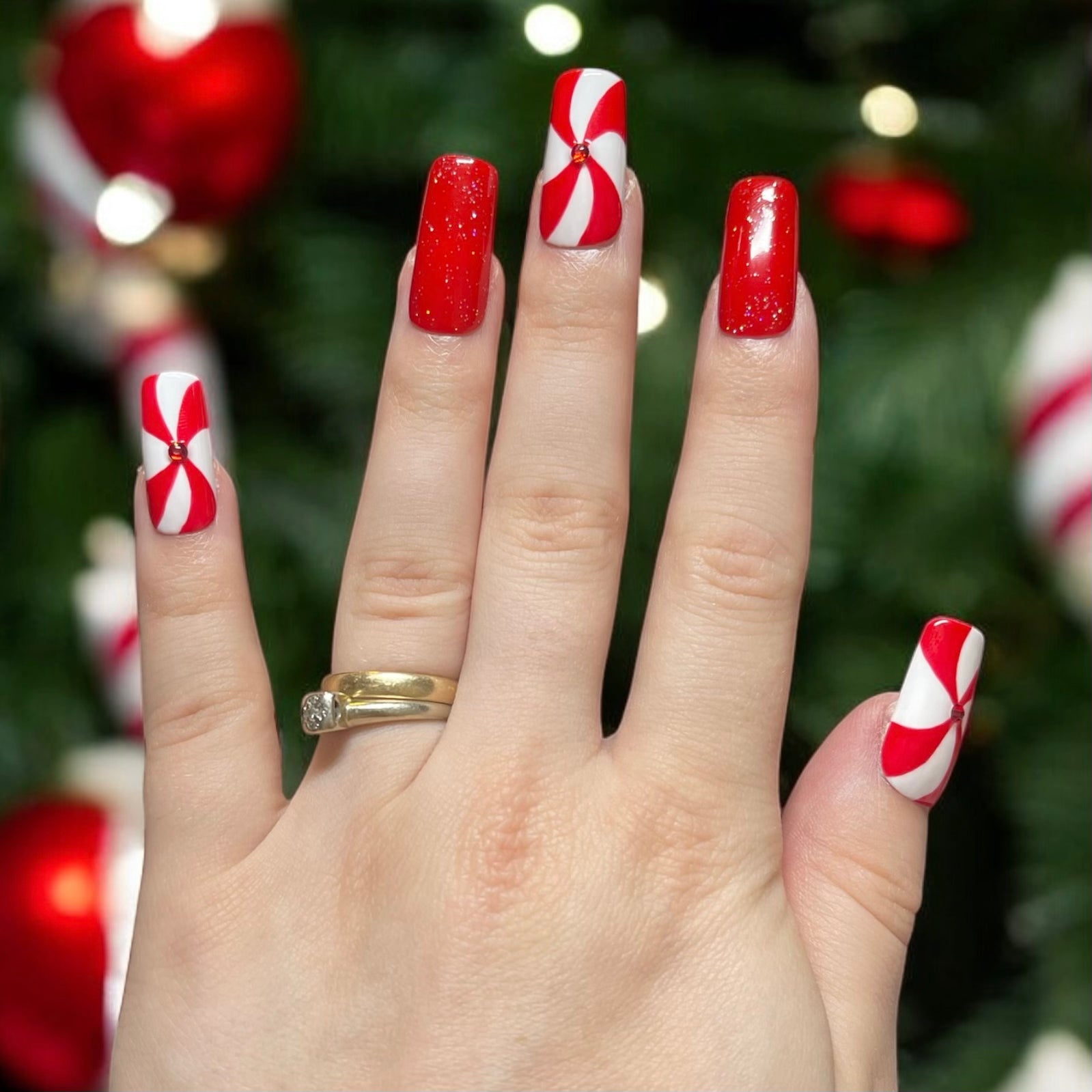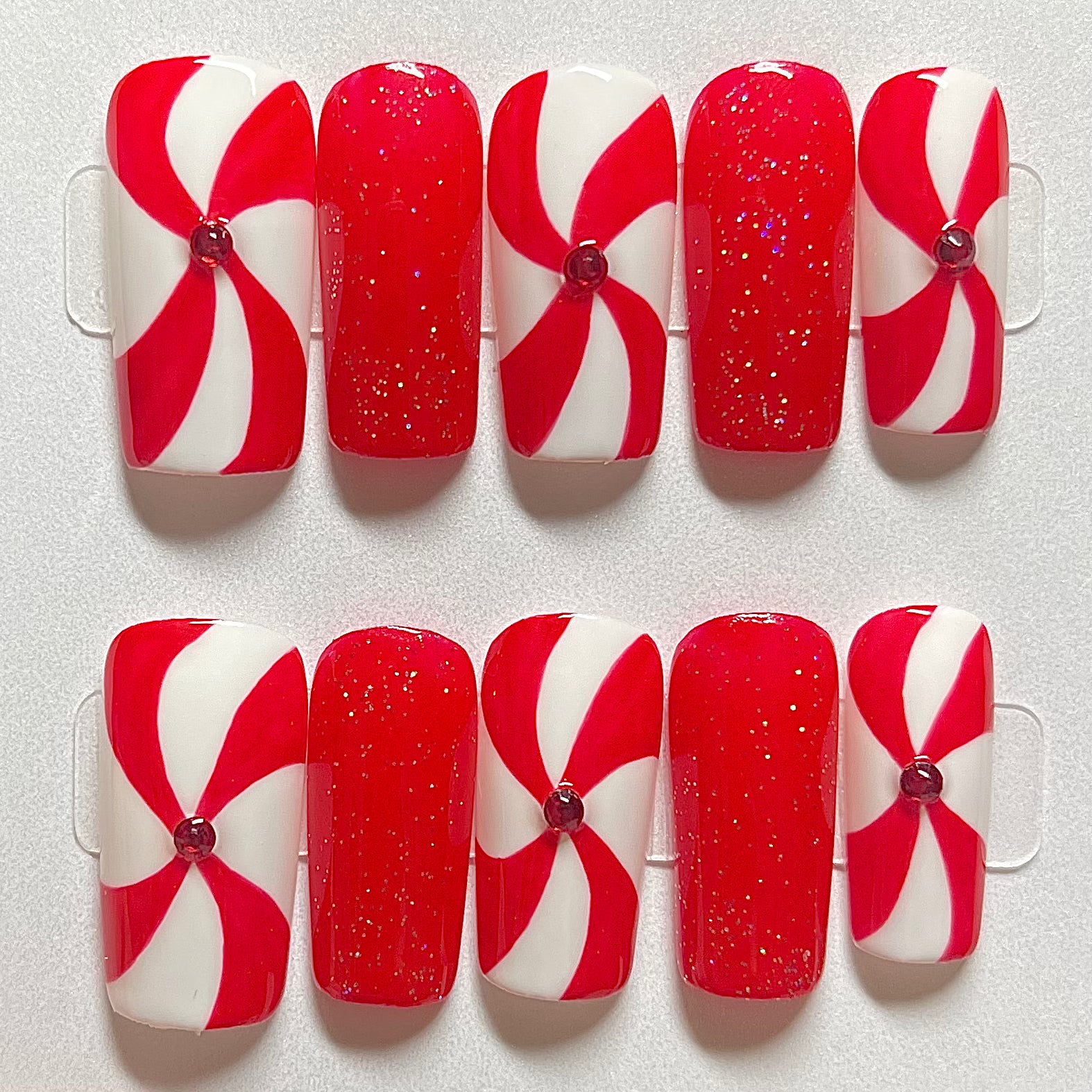 Peppermint Swirl press-on nails are a festive, sweet treat for your fingertips, featuring a charming candy cane-inspired design with bold red and white swirls.