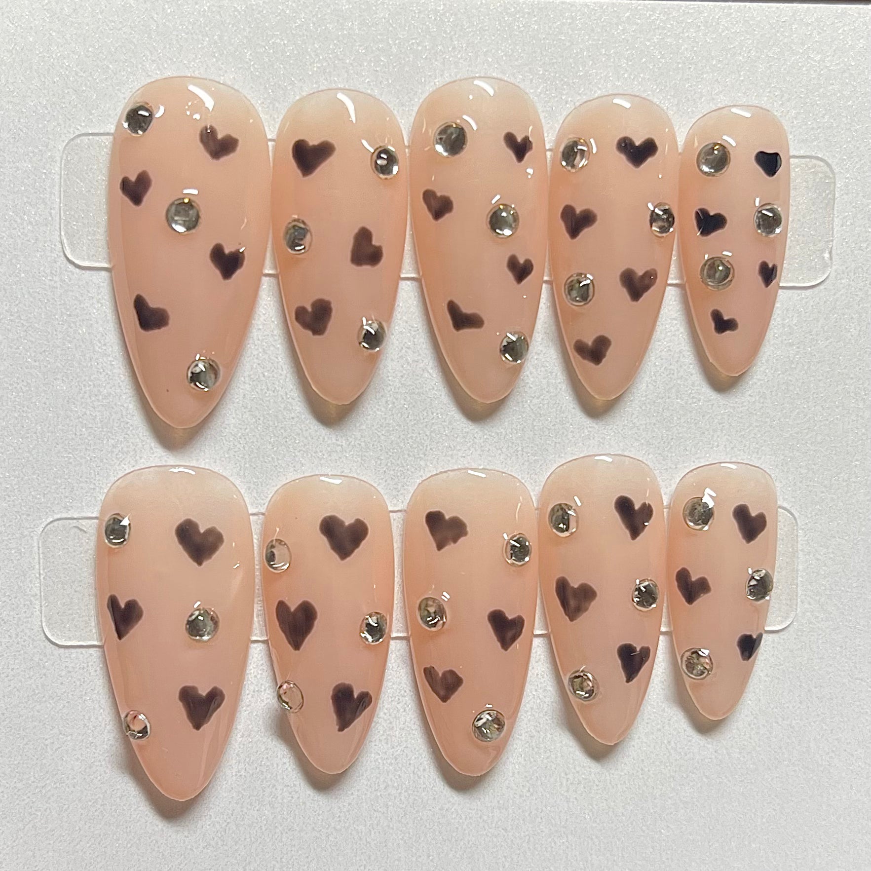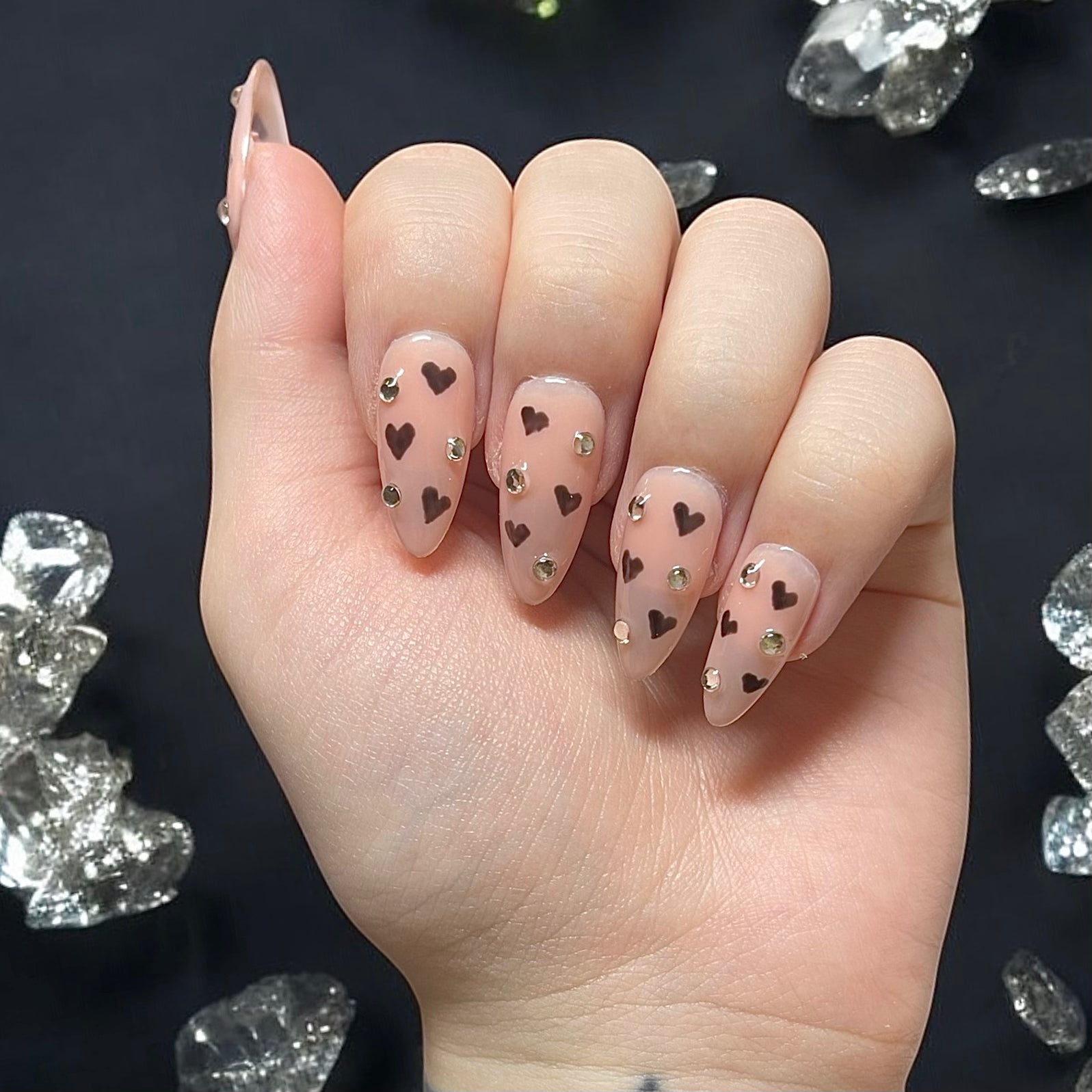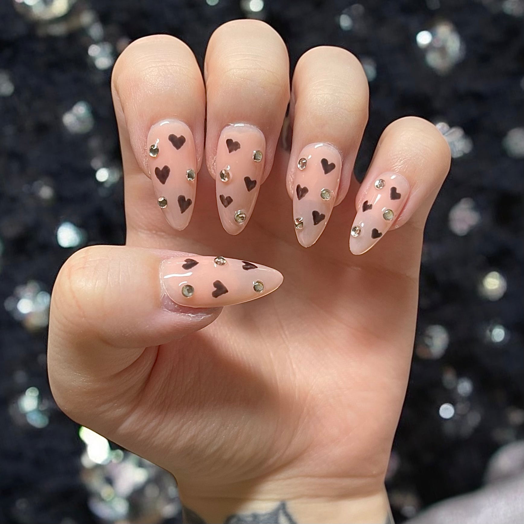 Embrace the season of love with these enchanting Sweetheart Sparkle press-on nails. Featuring a soft, blush pink base, each nail is adorned with dazzling heart-shaped gems and subtle sparkles, creating a romantic and feminine look that’s perfect for any special occasion.