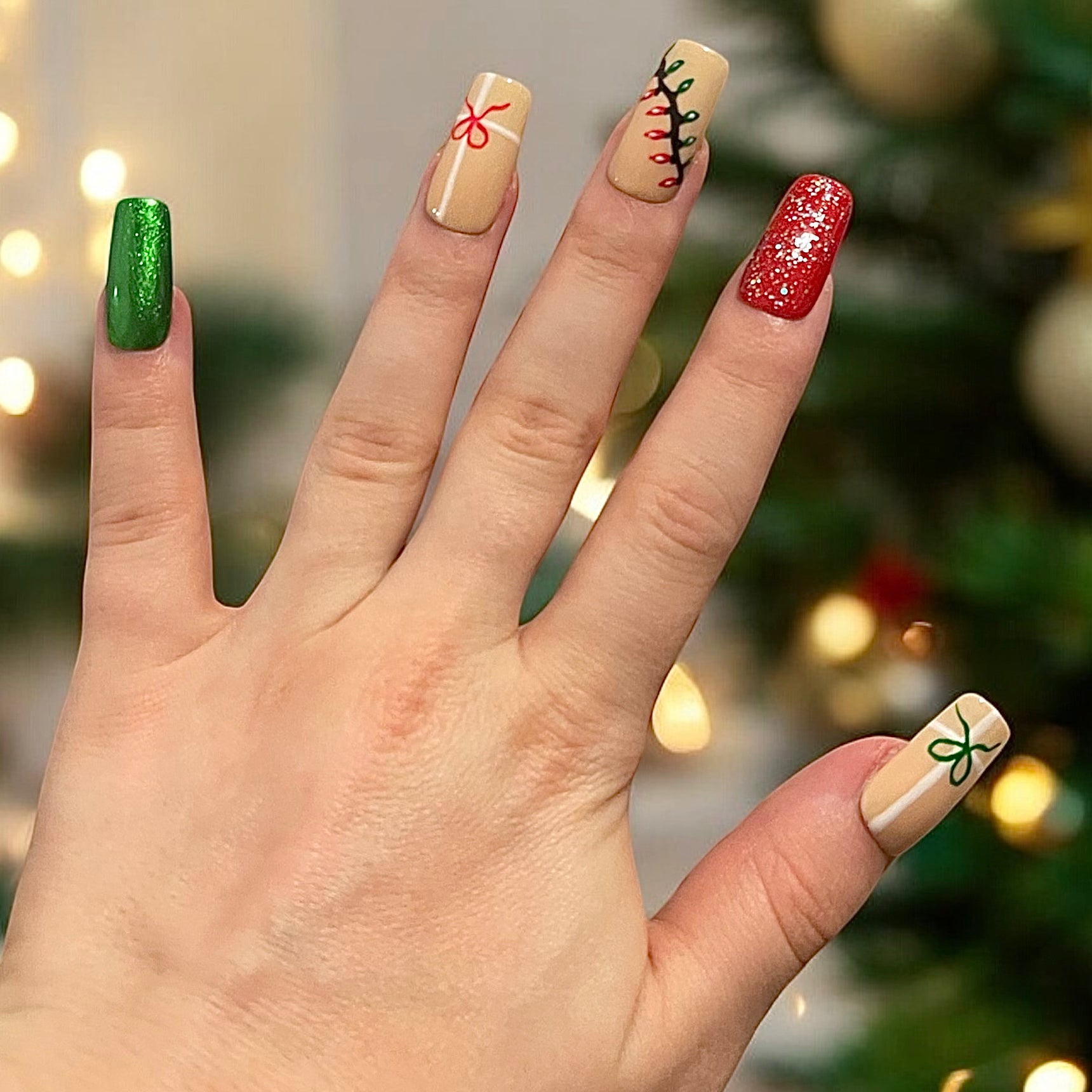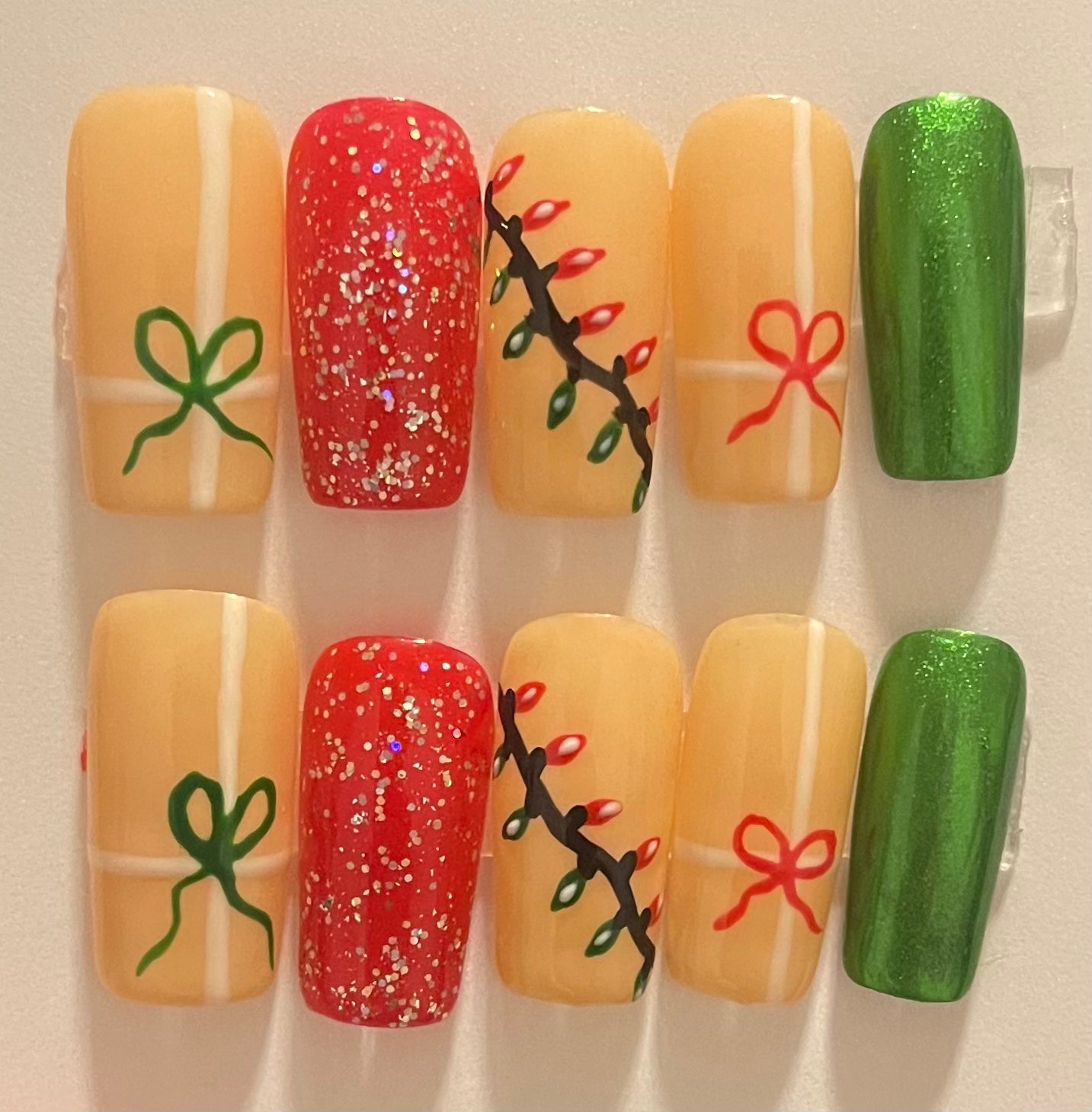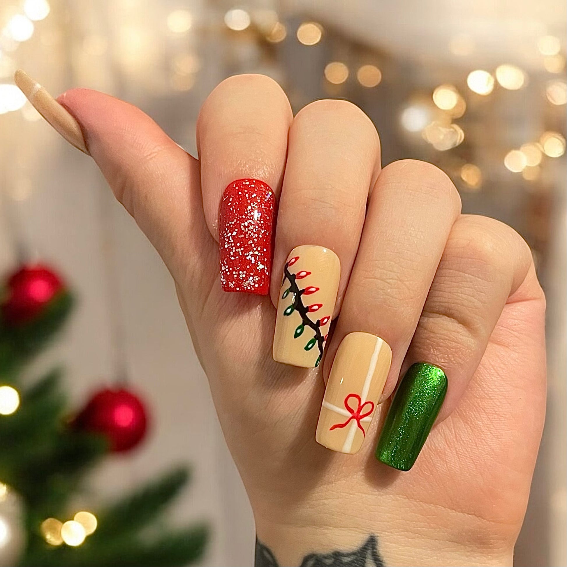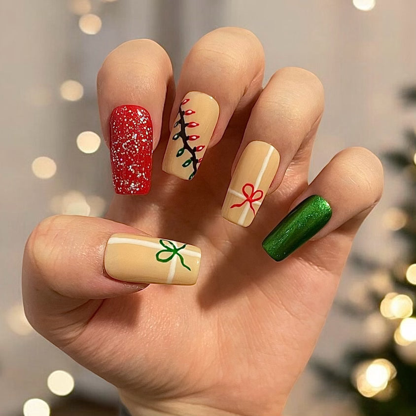 These stunning press-on nails bring the holiday spirit straight to your fingertips! Adorned with beautifully wrapped presents, twinkling Christmas lights, and a touch of glittering sparkle, these nails will add the perfect festive flair to any celebration.