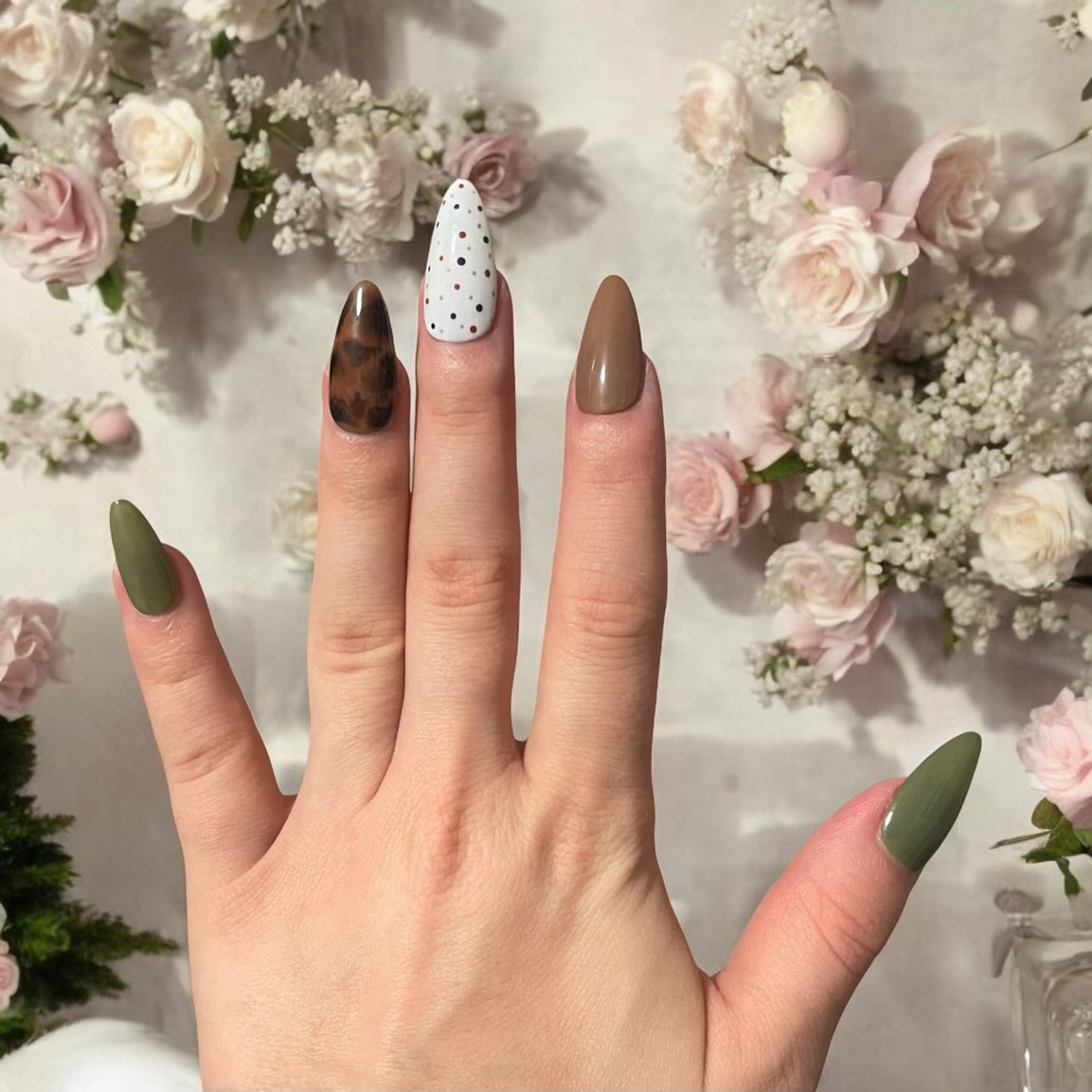 These chic press-on nails feature rich green hues with playful polka dots on one nail and a stunning brown tortoise shell accent nail. A perfect blend of earthy elegance and fun, these nails add a touch of sophistication with a playful twist.